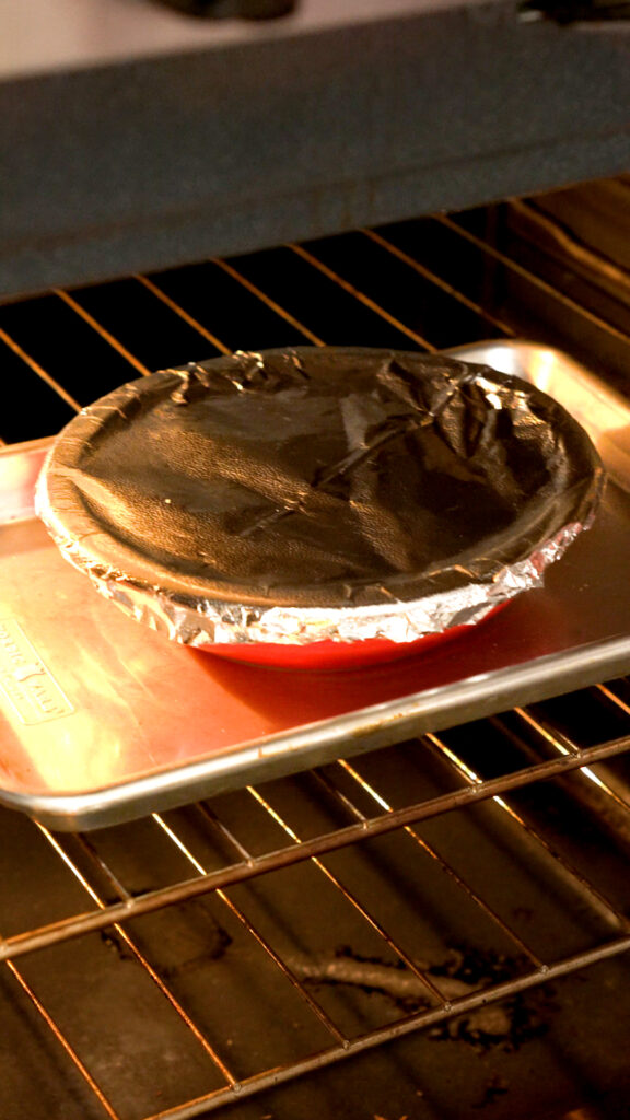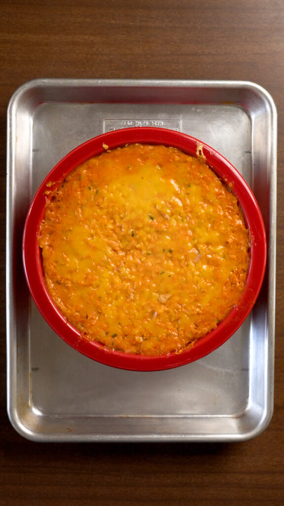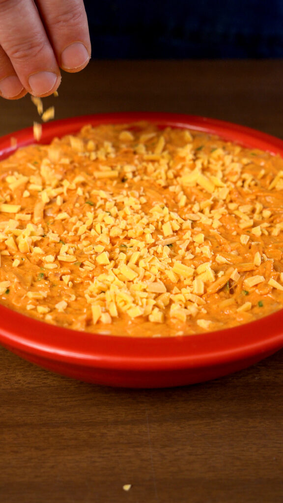- Add to an oven safe dish. You can sprinkle on some more vegan cheddar shreds if you like. It's optional, but if you do I recommend covering the dish with foil to help the cheese on top melt.