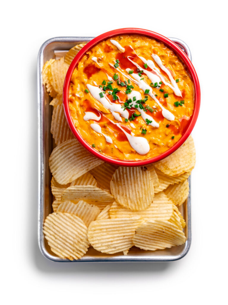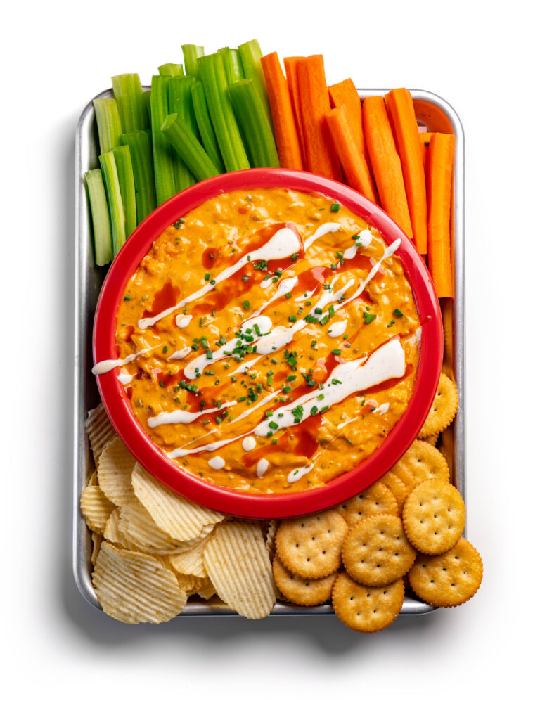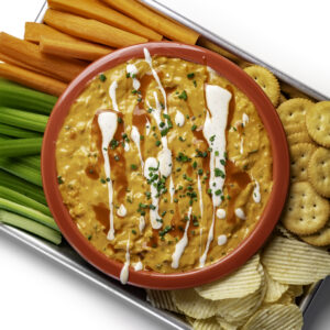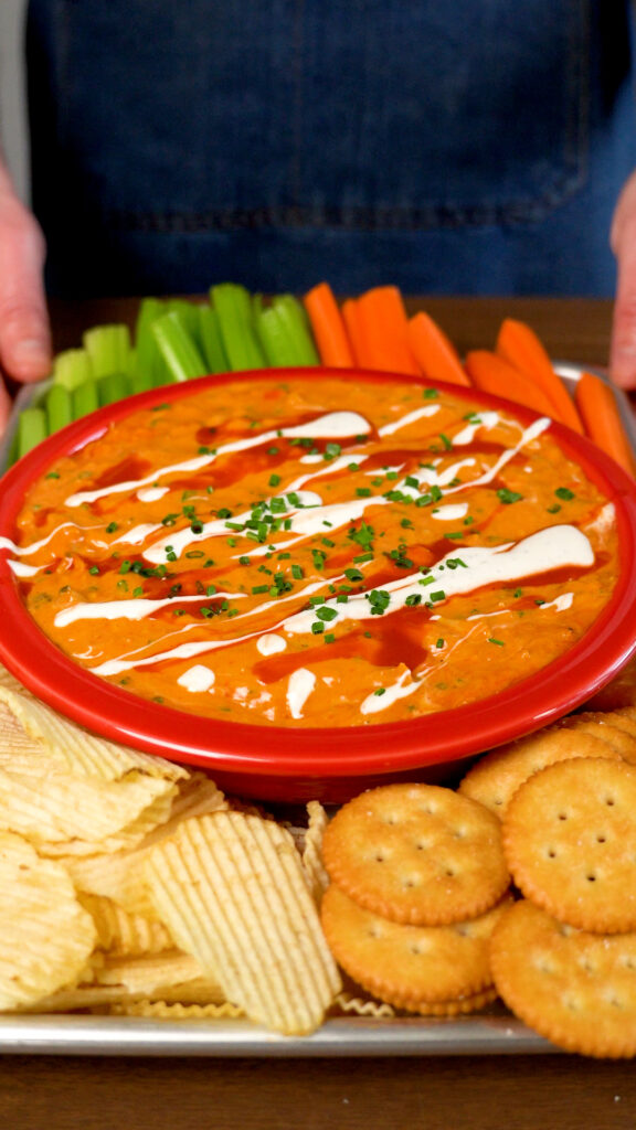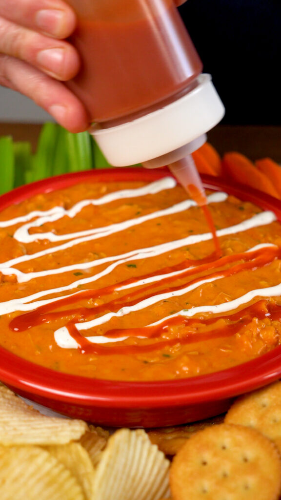 - Drizzle with more Ranch and Buffalo Sauce, and some chives. Serve with crackers, chips, celery and carrots and enjoy!