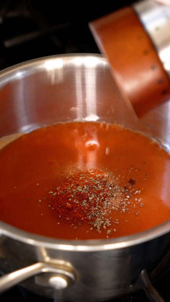- In a saucepan over medium low heat, add the hot sauce, garlic powder, worcestershire, cayenne, and salt and pepper. Then add in the cornstarch slurry. Whisk to combine.