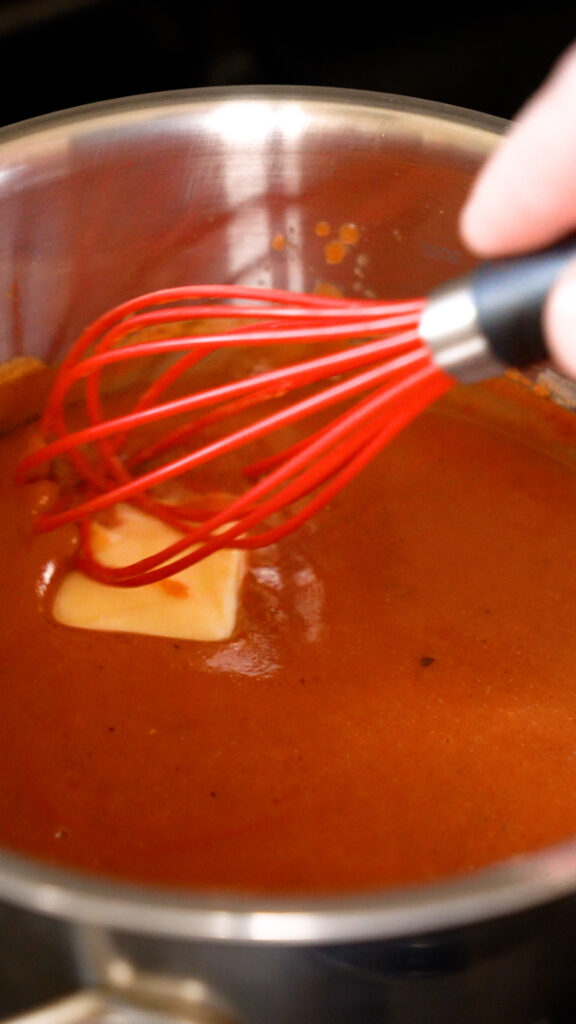 - Once the sauce starts bubbling, turn off the heat. Add 1 Tbsp worth of the vegan butter and whisk until fully melted. Repeat with another Tbsp worth of the vegan butter, and repeat until the entire stick has been whisked in.