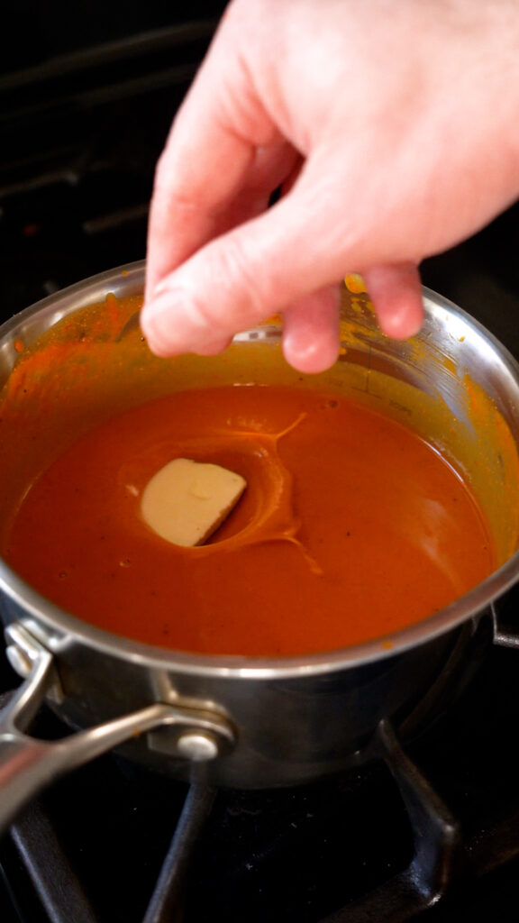 Then once it’s at a light boil, kill the heat, and add 1 tablespoon of vegan butter. Whisk it until melted, and then repeat with the remaining vegan butter a tablespoon at a time.