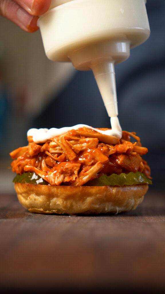 - Toast your rolls in a pan over medium heat. Then assemble the sliders with some dill pickles, the Buffalo Jackfruit, some Vegan Ranch and Chopped Chives and enjoy!