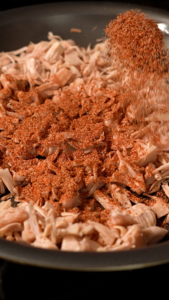 - Preheat a 12 inch skillet over medium heat. Add a little oil and then the jackfruit, stir to coat in the oil. Cook for about 3 – 4 minutes and add in the dry rub. I suggest adding in 1 Tbsp at first and tasting and adding more if you like.