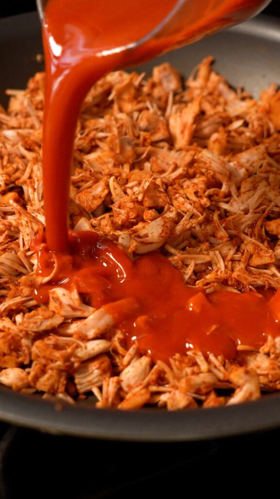 Drain the jackfruit, and then shred it by hand or with a potato masher. Add it to a pan over medium heat. Season it, then drench it in Buffalo Sauce. It’s that easy!