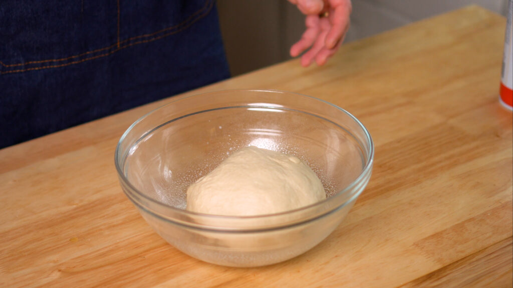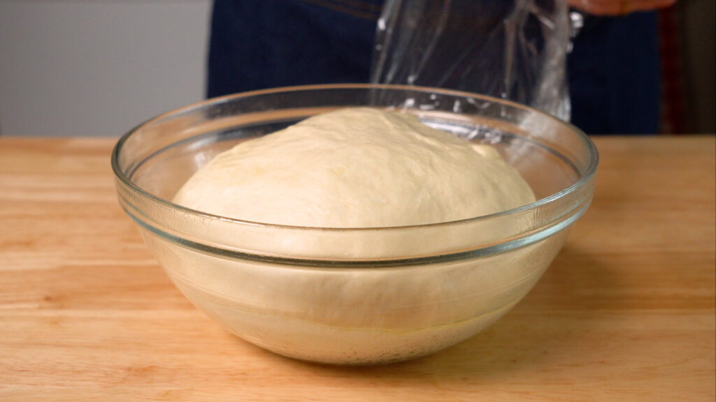 - Add the dough ball to a greased bowl and cover with greased saran wrap or a clean towel. Let it proof and rise for about 1 hour or until doubled in size. I usually do mine in the oven with the light turned on.