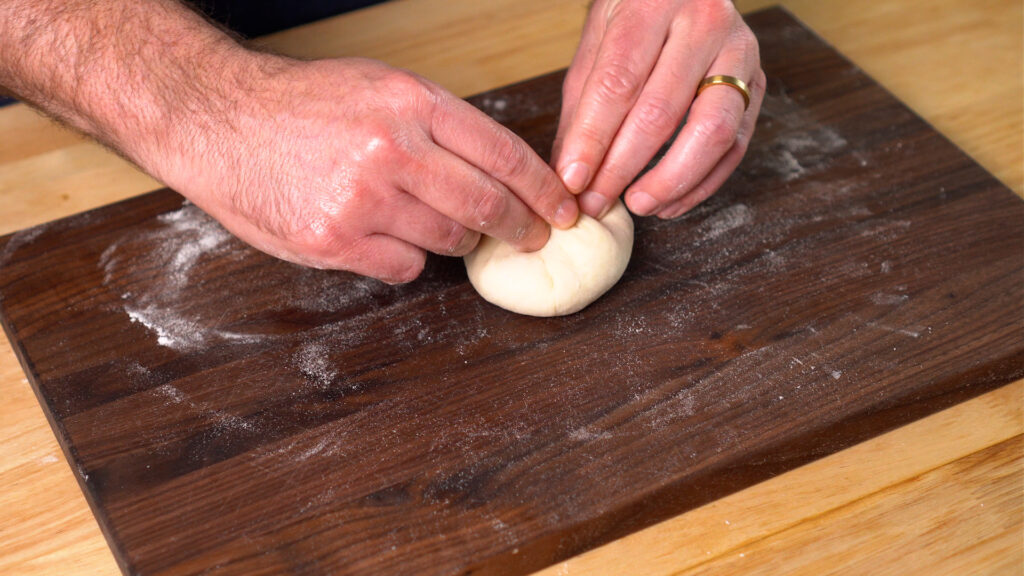 - To form the pieces into balls, tuck each corner under itself and pull the edges to form it into a ball. Then rotate the ball in between your thumb and finger. Keep it in constant contact with the cutting board / work surface. Keep rotating the ball to create tension and to close the seam up on the bottom.