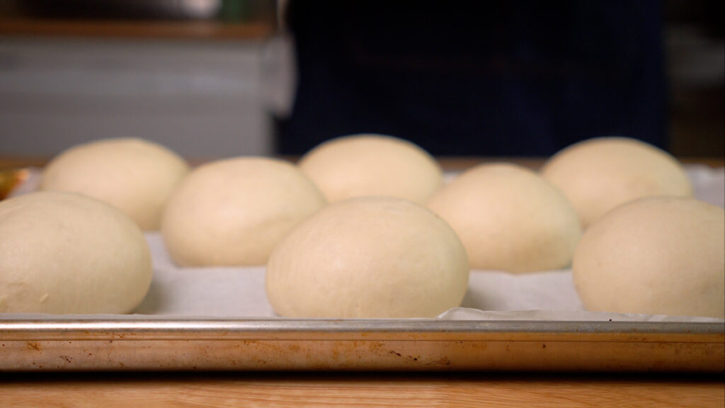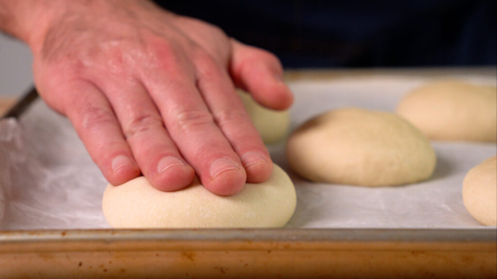 - Add it to a parchment lined baking sheet and flatten the ball out with the palm of your hand. Repeat with the rest of the dough and then cover them with another sheet tray or clean towel to second proof for about 45 mins – 1 hour.