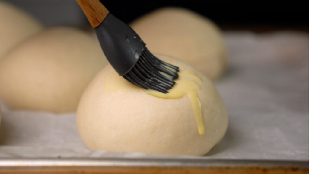 For the Just Egg, you really need to dilute it in something as it’s too thick on its own. I found that the buns brushed with only Just Egg resulted in streaks since the Just Egg is so thick it won’t evenly disperse. Try either a 2:1 ratio with plant milk (so 2 Tbsp of plant milk for every 1 Tbsp of Just Egg) or a 3:1 if using aquafaba (so 3 Tbsp of aquafaba for every 1 Tbsp of Just Egg). Personally I got the best results with the aquafaba and Just Egg blend, but all three work great.