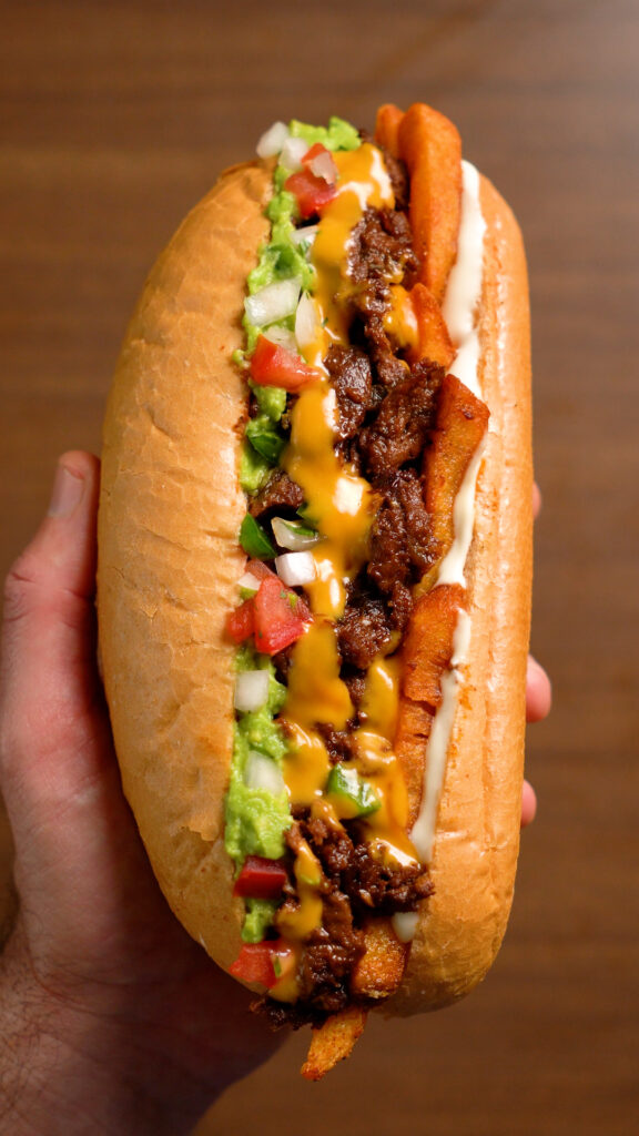 - Split your roll in half, leaving a hinge. You can hollow it out a bit if desired. Then layer vegan sour cream on one side, and the guacamole on the other, then add fries, asada, cheese (sauce), and pico de gall. Roll up the sandwich in deli paper if desired. Enjoy!