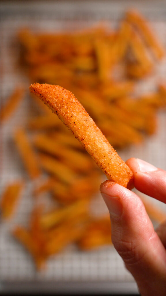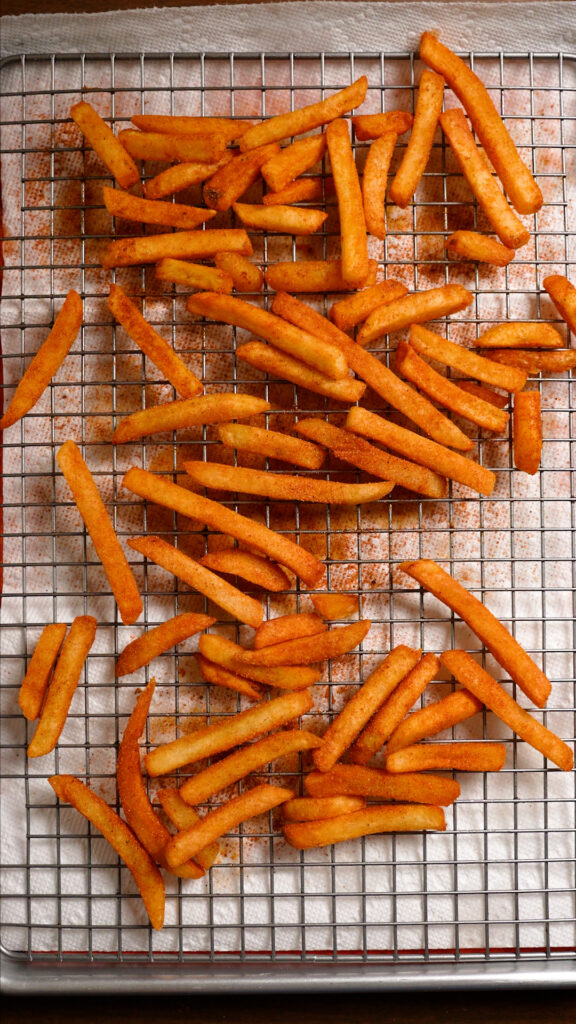 - Bake or Air Fry your Frozen Fries according to the instructions. Season with Taco Seasoning! You can also Deep Fry them if you wish. Bring a pot of neutral oil (like Vegetable, Peanut or Canola) up to 375 F. Carefully add the fries in batches and fry until golden brown. Remove and season immediately with the Taco Seasoning. Let them rest on a wire rack.