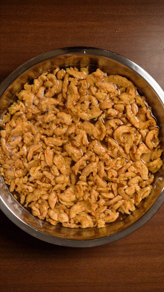 - Rehydrate the soy curls by covering them in some water for about 10 minutes.