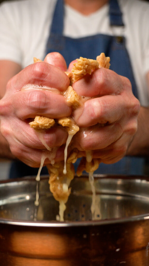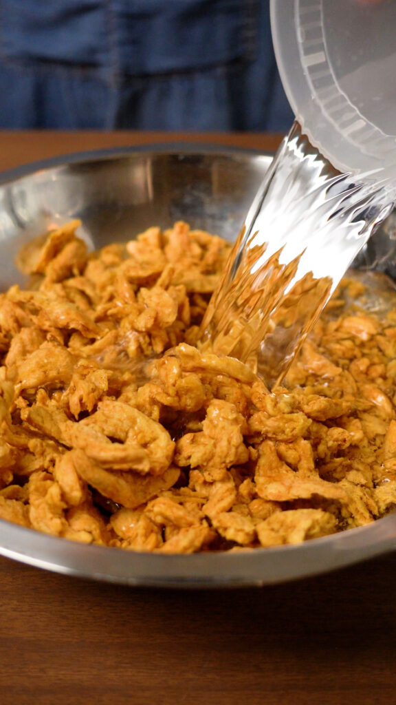 - Strain your soy curls, and using your bare hands, squeeze out the excess water. You want them to be as dry as possible.