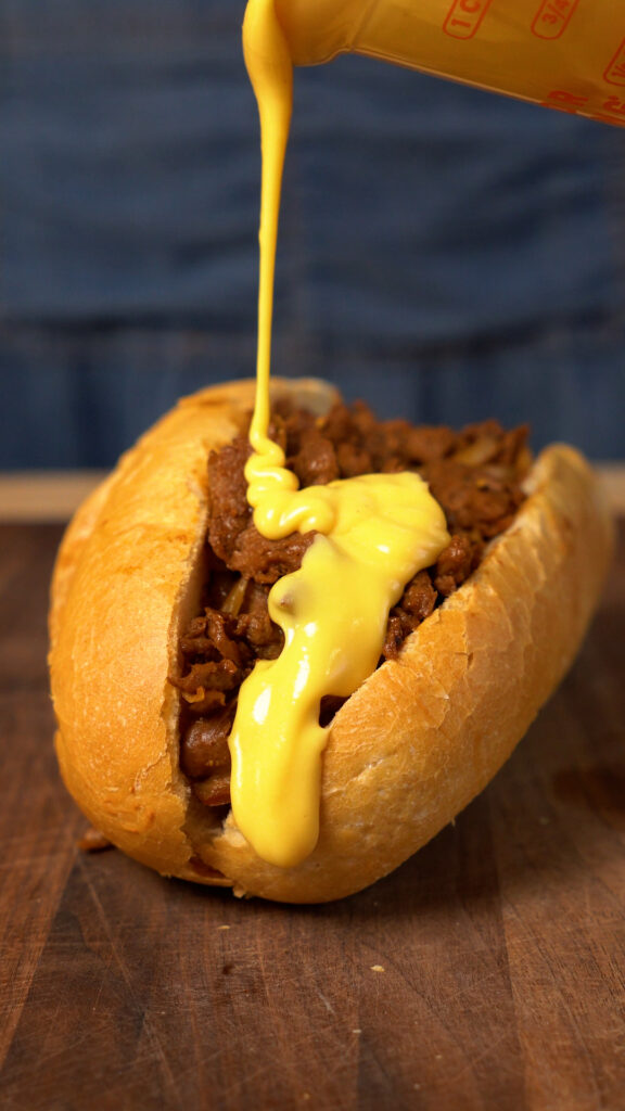 Load up your roll with the vegan steak, and drizzle on some whiz and enjoy!