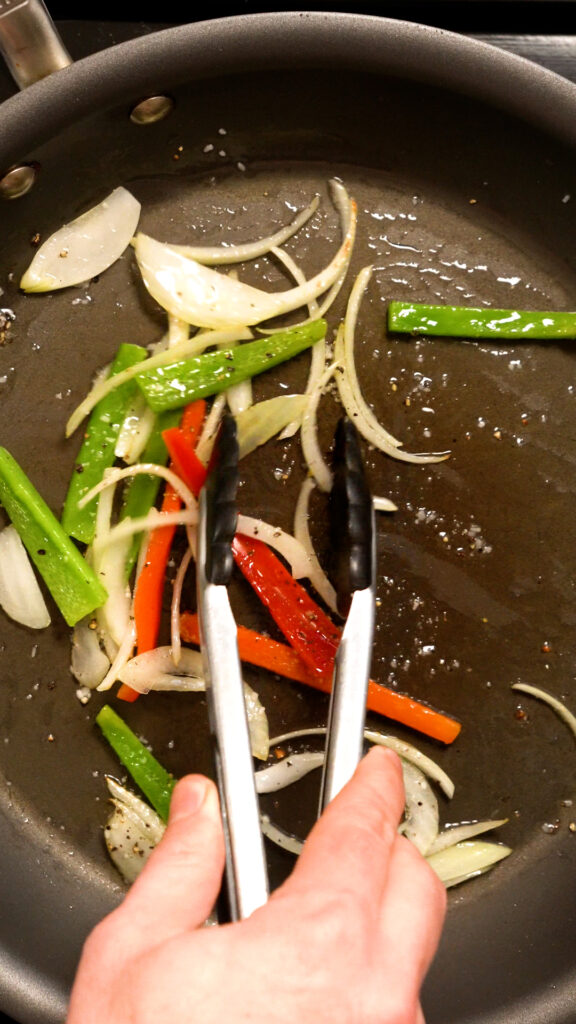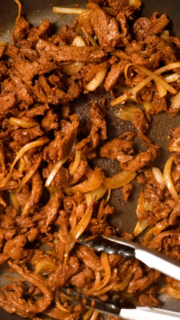 In my opinion, onions are mandatory. Whether diced or thinly sliced, they just add so much flavor and accents the soy curl beef perfectly.