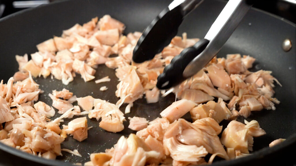 - In a skillet over medium heat and a little oil, cook the jackfruit or tofu for about 6-8 minutes. Season with the nutritional yeast, garlic powder, onion powder, salt and pepper to taste, and anything else you might want. Remove from the heat once they get slightly browned, and let cool completely.
