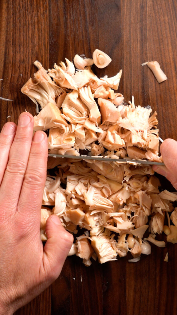 - Drain and wash off jackfruit. Chop up to your desired consistency. If using tofu, cube it up into bite size chunks. You can tear them in half or just tear off chunks from the block for a rougher texture.