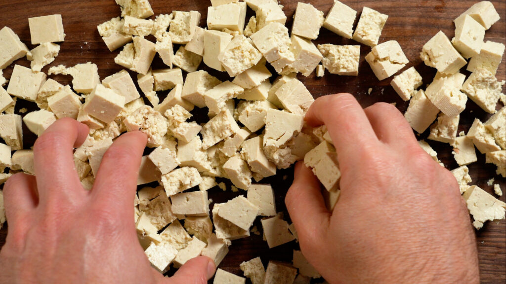 Whether you use Tofu or Jackfruit, we will be cooking and seasoning them first. This is to infuse some flavor, but also to dry them out a bit. Water is the enemy of chicken salad, so anything we can do to reduce that will help us avoid chicken salad soup!
