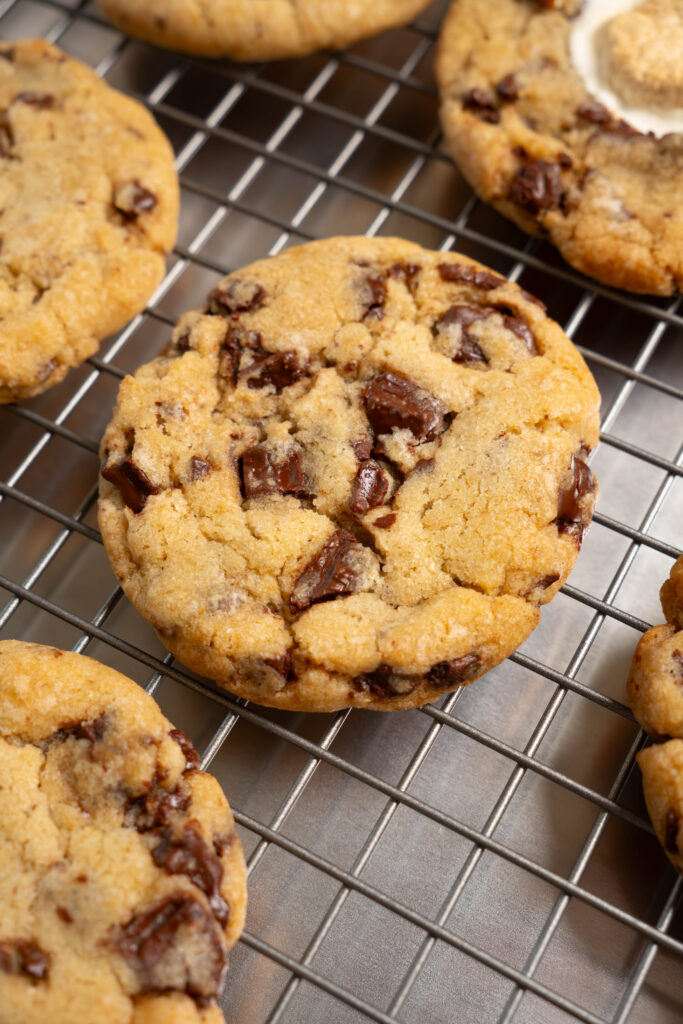 Baking time will greatly affect the texture of your cookies. 8 minutes will give you a thicker and softer cookie. 10 minutes will cause it to spread a bit more, and 12 will get you some crackled edges that are slightly crispy, with a chewy center. I personally prefer the 10 – 12 minute time frame.