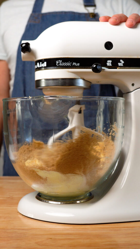 - In the bowl of a stand mixer, add the softened vegan butter and white and brown sugar. Use the paddle attachment and cream the butter and sugar on medium high speed for about 3-4 minutes, or until slightly fluffy. Scrape down the sides as need be.