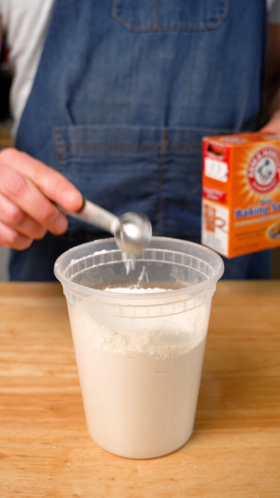 - To a large bowl, add the flour, baking soda and baking powder, and salt. Whisk to combine. I recommend weighing the flour to 360 grams. Use more if needed.