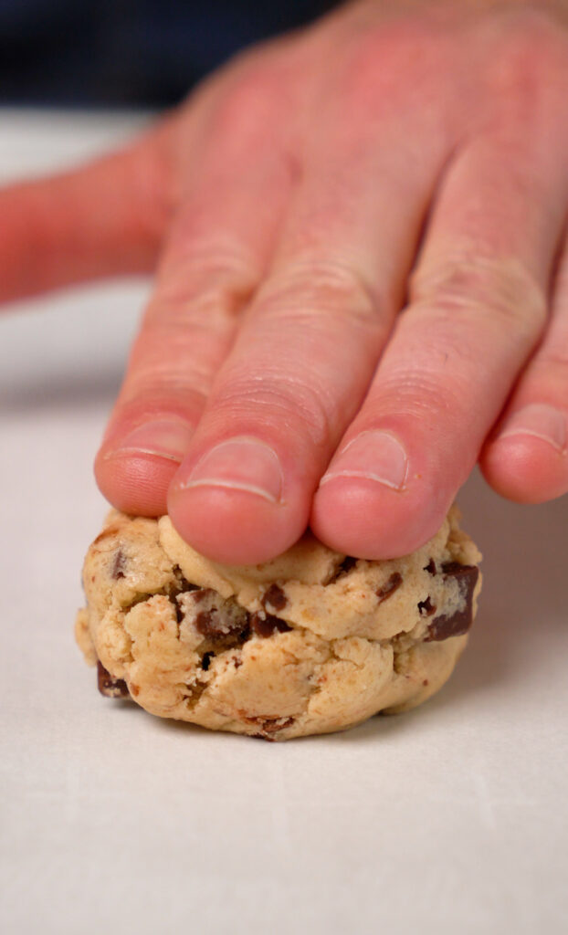 - Stop the mixer and add in the chocolate chunks or chips, then mix on low until the chunks / chips are well combined into the dough.