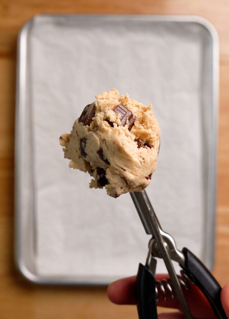 - Scoop out about 3 heaping Tbsp or 50 grams worth of the dough. Roll it into ball and place on the parchment lined baking sheet. Smoosh it down a bit with your hand to form a disk. I recommend baking 2-3 cookies as a test run to figure out how long you want to bake them. I would go for anywhere between 8 – 12 minutes. The longer you go, the more the cookies will spread and get crispy.