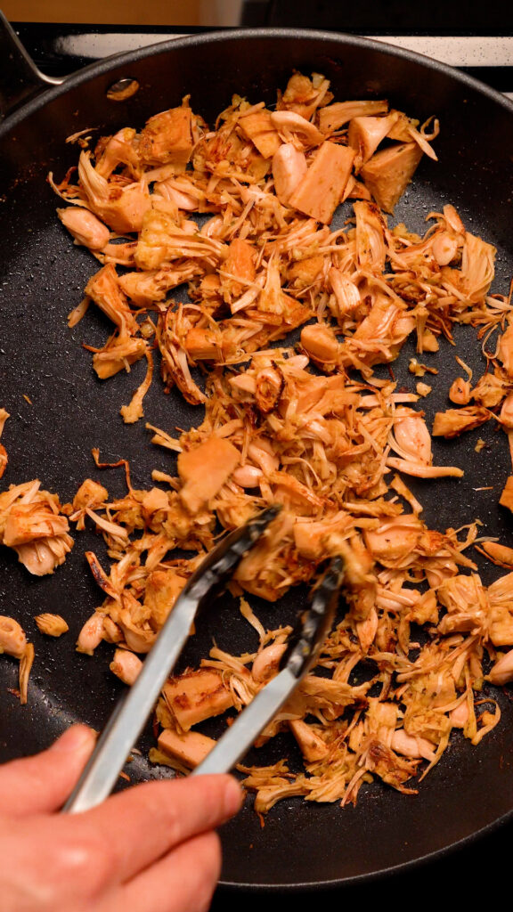 - In a pan over medium heat, cook the jackfruit until the liquid has been reduced and you see some browning (should take about 10 minutes).