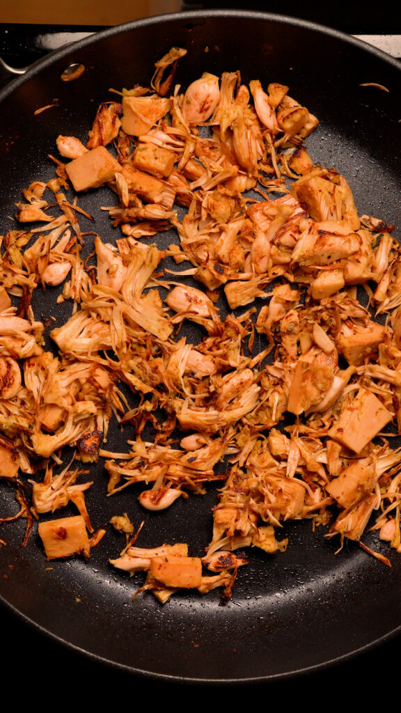 In a pan over medium heat, cook the jackfruit until the liquid has been reduced and you see some browning.