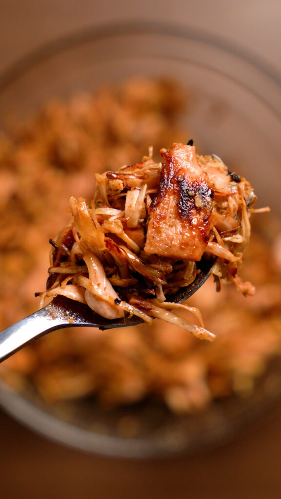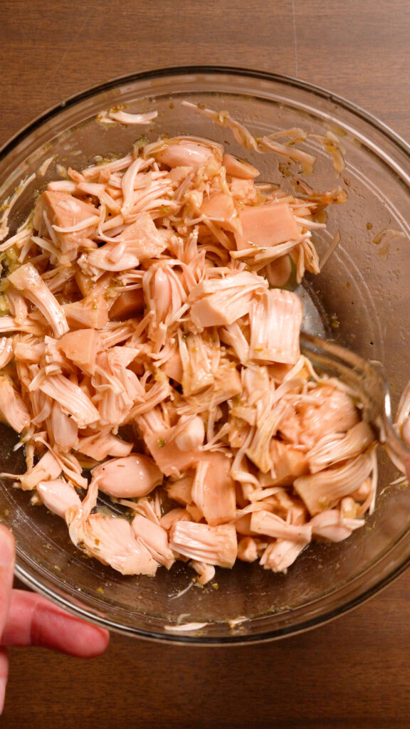 - Combine everything else in a bowl, then add the shredded jackfruit and toss to coat thoroughly.