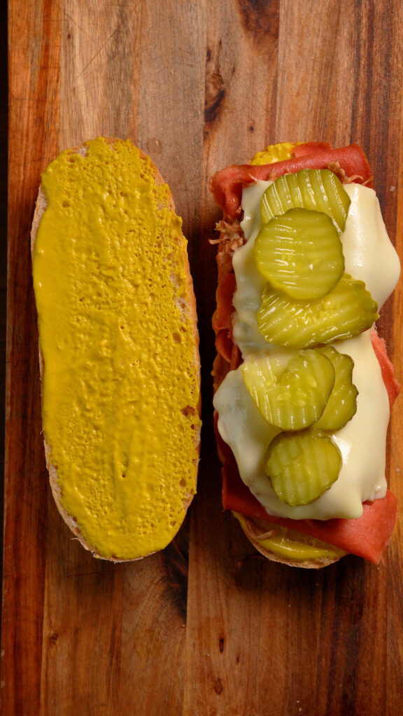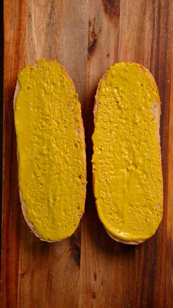 To assemble the sandwich, split the roll and spread plenty of yellow mustard on both sides.