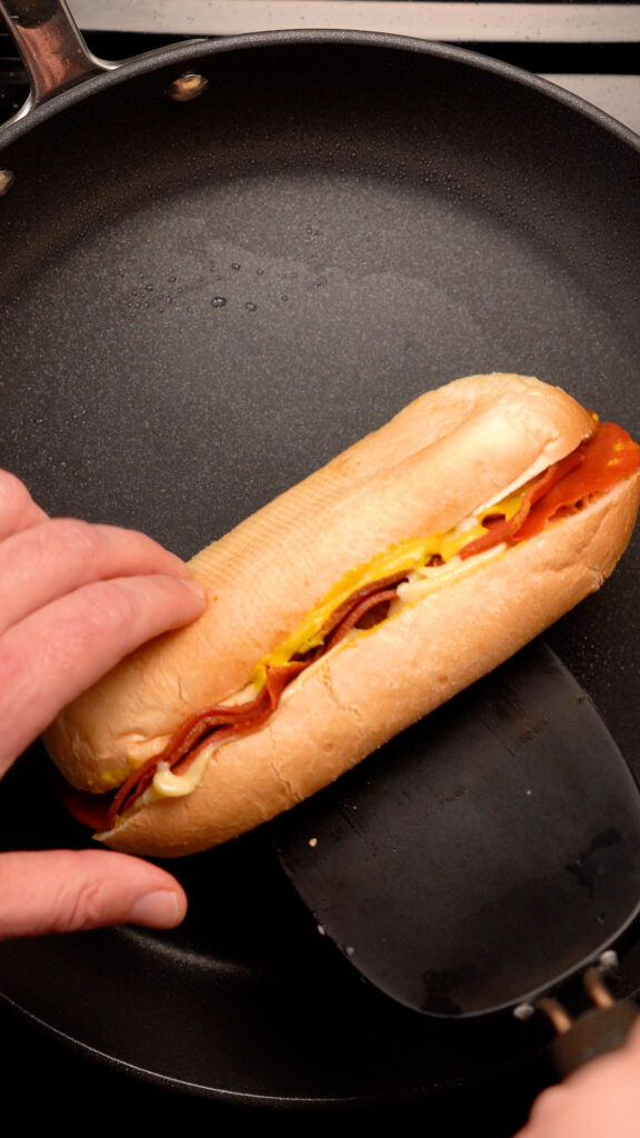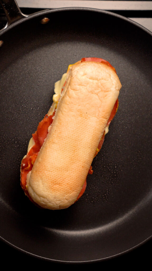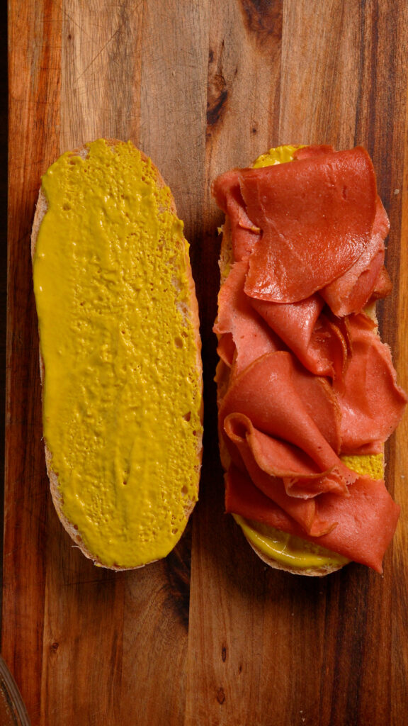 - Optional but recommended, you can heat up the vegan ham in a pan for a minute or so. Then add a few slices of the Vegan Ham to your roll.