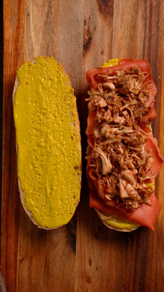 I’ll also be using some Vegan Provolone (I like Follow Your Heart) and some Yellow Mustard and Dill Pickles. The mustard and pickles are key in my opinion, they really cut through the Vegan Ham and Jackfruit!
