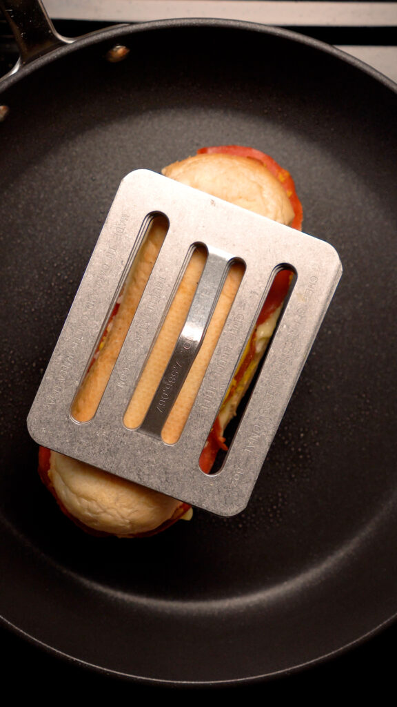 You can add the cheese at this point, but in my tests I found that it doesn’t really melt as much as I’d like. So this is optional, but I like to pre-melt the cheese by adding some water to a heated non-stick pan, then the cheese. The water will steam and melt the cheese and keep it from sticking to the pan. Then you can scoop it up with a spatula and add to the sandwich. But this is totally OPTIONAL!