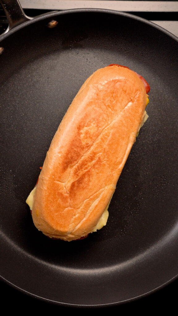- Slap the cheese on top along with some pickles. Add the top roll and then grill the sandwich in a pan on medium heat. Press it with a grill press, spatula, another pan, whatever works! Obviously a panini press will be perfect if you got one! Once it's browned, flip it over, and repeat. Then cut in half and enjoy!