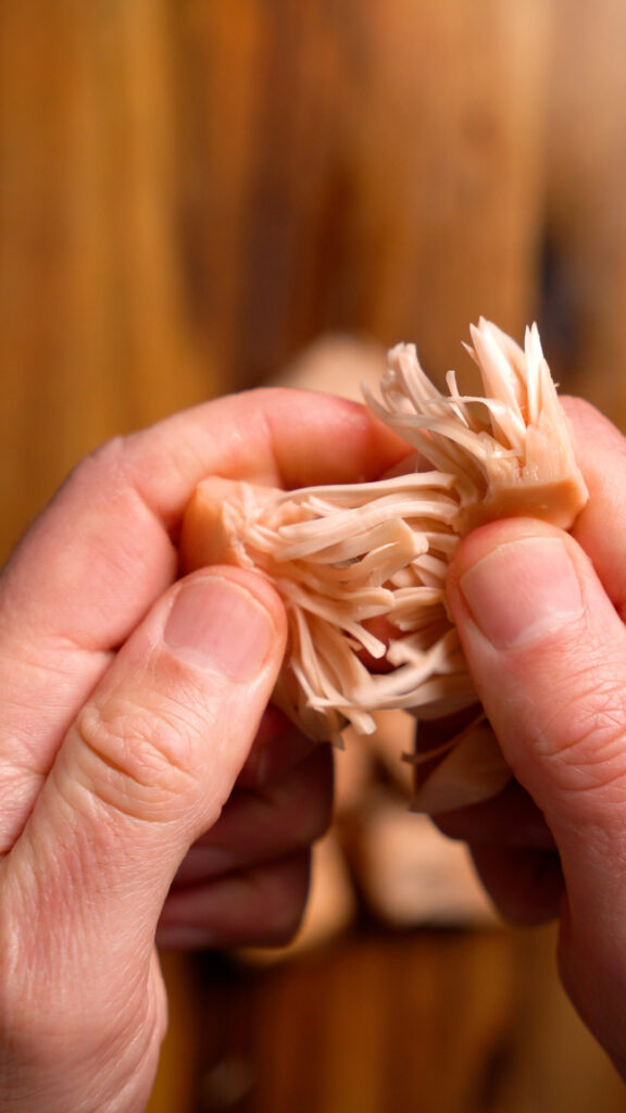 To make the Mojo Style Jackfruit, drain and shred the jackfruit with your hands or a knife.