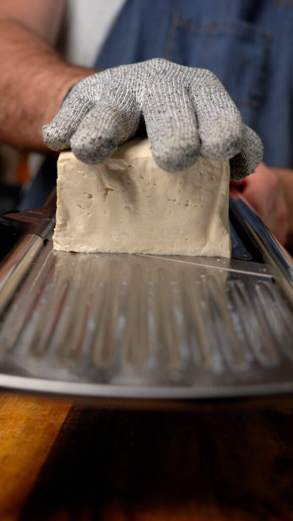 - First slice your tofu as thin as you'd like. You can use a sharp knife, but I prefer a mandoline slicer!If using a mandoline, I like to flip over or turn the tofu 180 degrees after every slice. Sometimes the corner of the block will start to break or crumble off if you put too much pressure on it. So changing that up will help it retain it's shape.