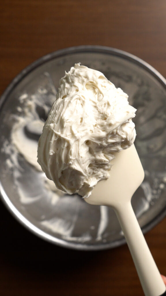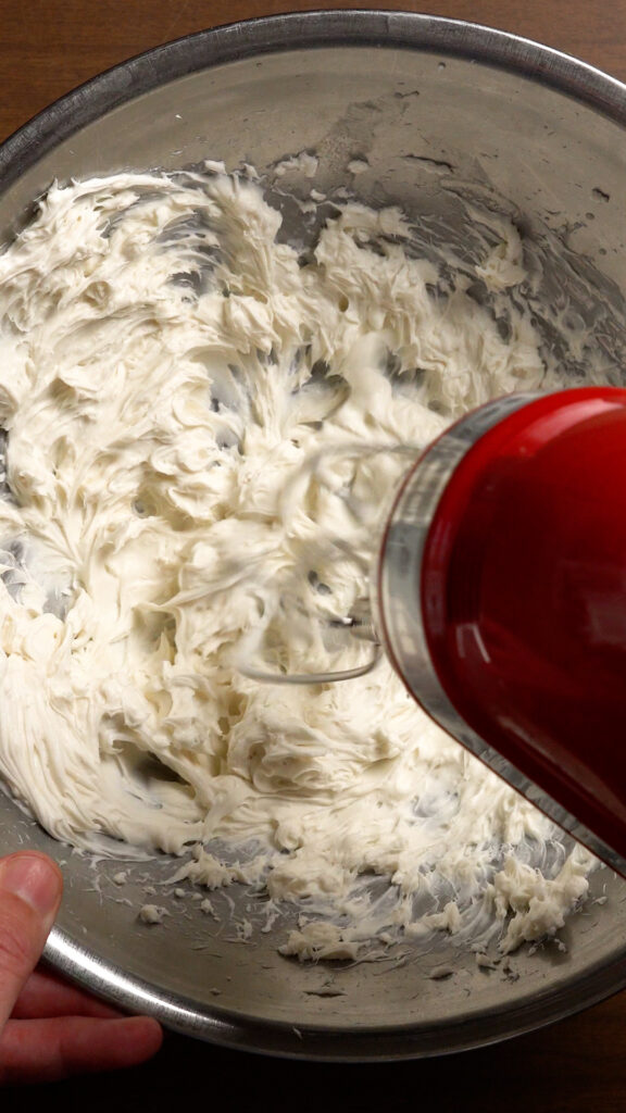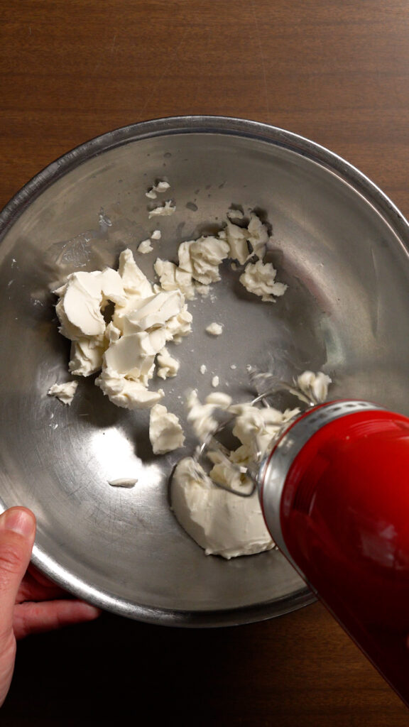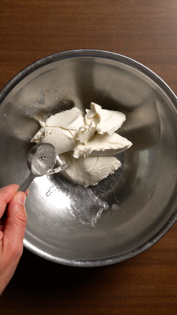While the tofu cools, add the vegan cream cheese to a bowl along with 1 – 2 Tbsp of seltzer water. Then use a hand mixer to whip the cream cheese until it’s smooth and creamy, almost like frosting!