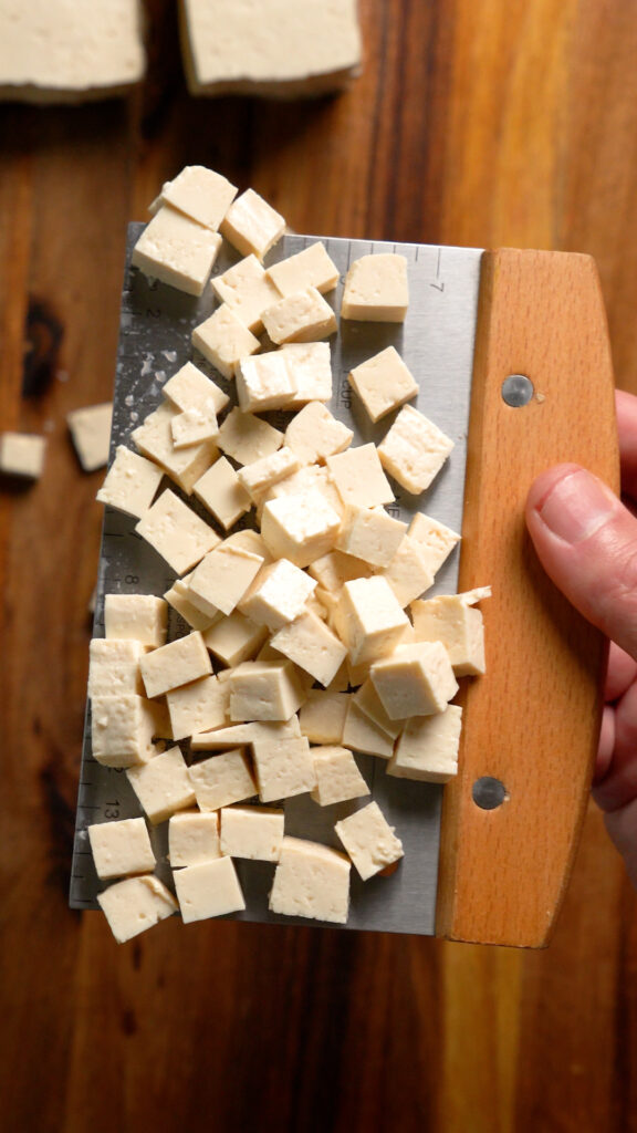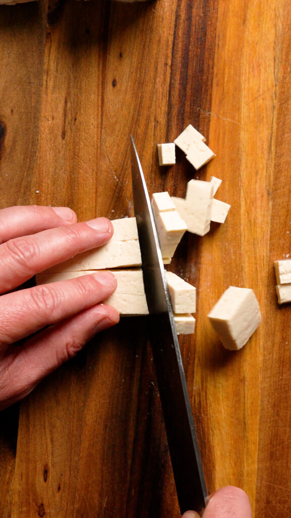 Take the tofu out of the package and pat it dry. You can dice it up into cubes like so.