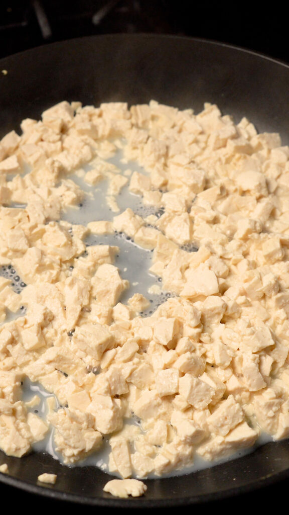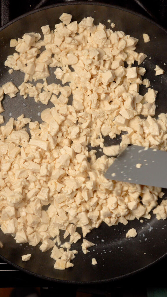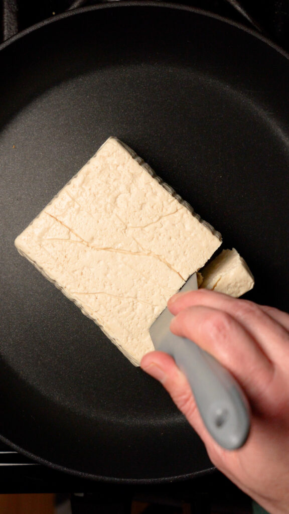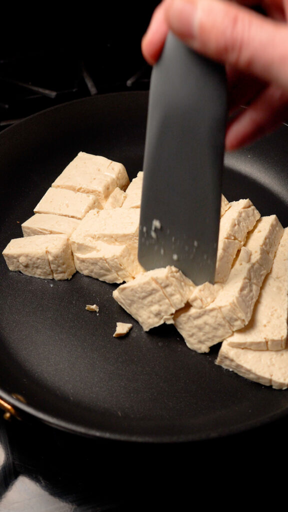 - You can also just add the entire block to the pan and roughly chop the tofu with a spatula.