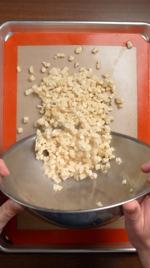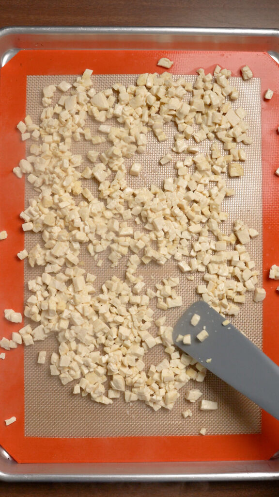 Once the liquid is cooked out, spread the tofu out over a baking sheet and let it cool.