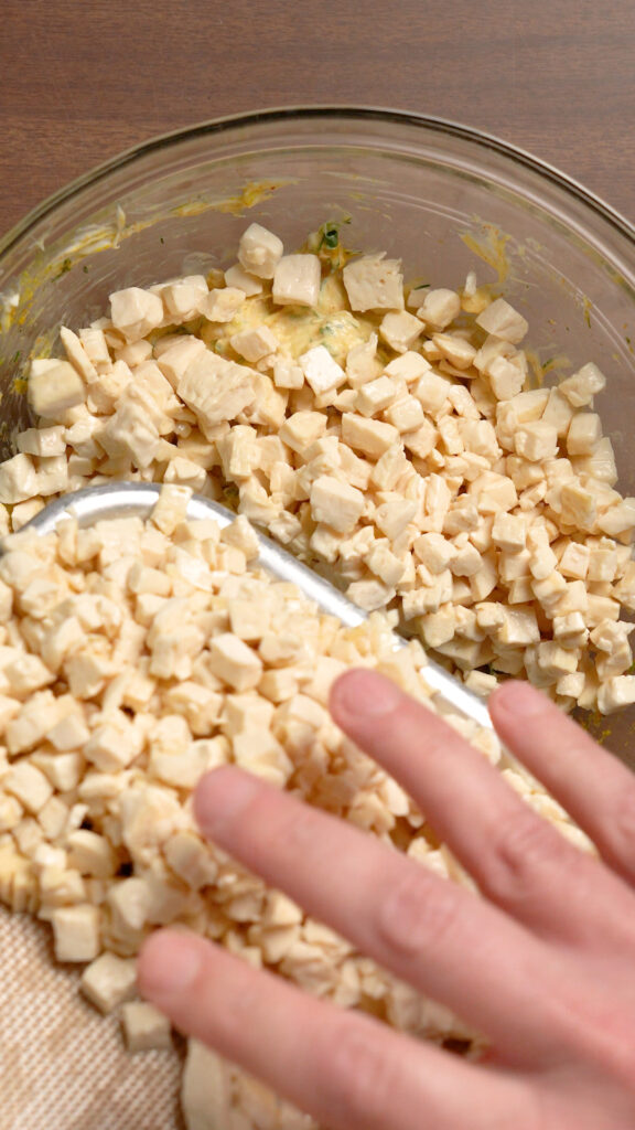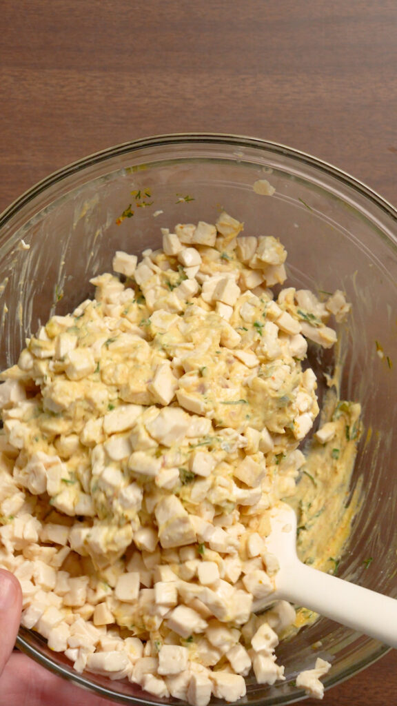 - Once the tofu is cooled fold it into the dressing. If it feels too thick you can thin it out with 1-2 Tbsp of water, vegan mayo or yogurt, vegan milk etc.