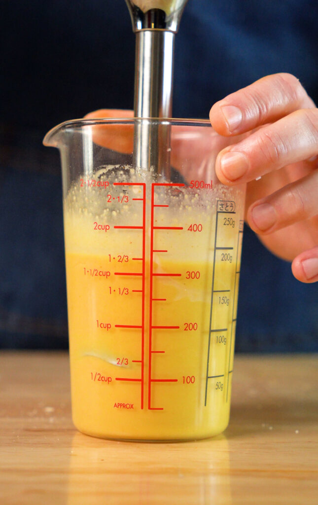 Speaking of emulsion, that’s exactly what we need to do with the yolk sauce. It’s mostly water and oil, and then a bunch of seasonings. I like to use my immersion blender to mix it up. You can use a normal blender, but you’ll need to drizzle the oil in slowly to emulsify it.
