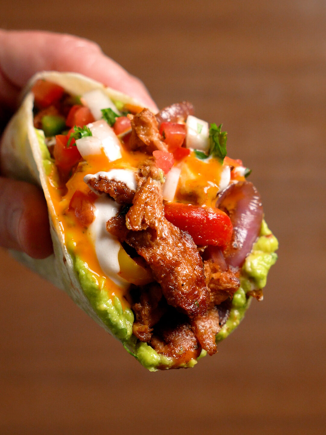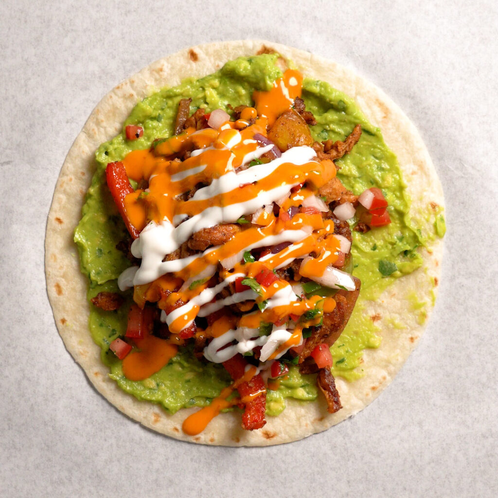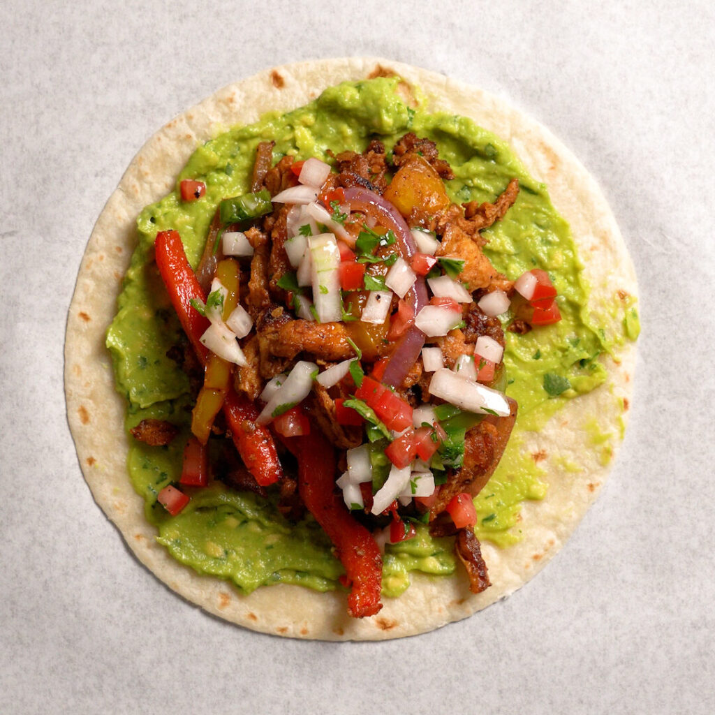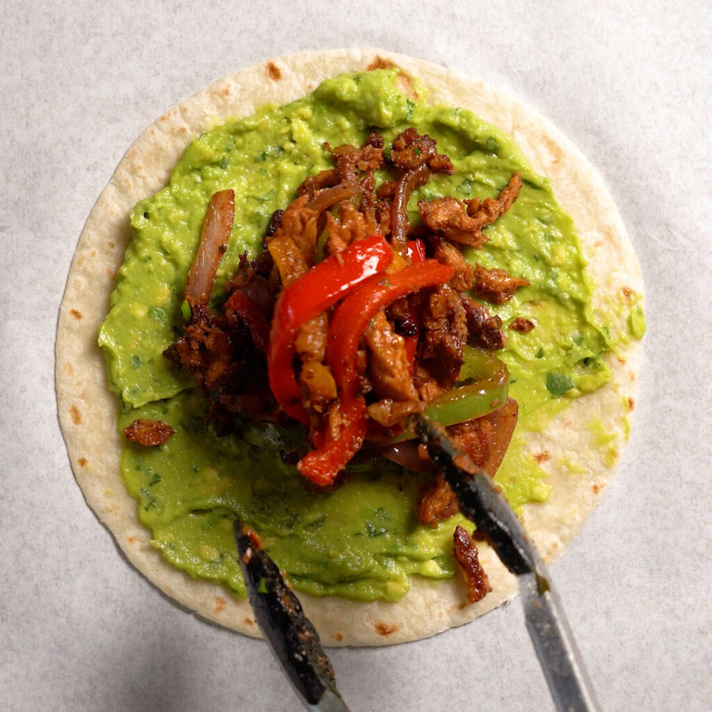 I like adding a layer of guacamole to a warmed tortilla, then the Fajitas, some Pico De Gallo, and Vegan Sour Cream and Hot Sauce!