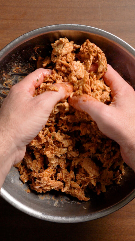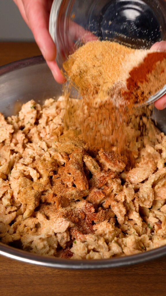 That is the recipe for the Soy Curl Chick’n. In order to get this tasting like Tex-Mex, we’ll be adding in some Chili Powder, Cumin, Garlic and Onion Powder, Coriander, Smoked Paprika and a little Soy Sauce at the end!