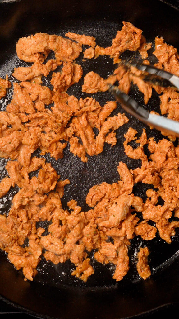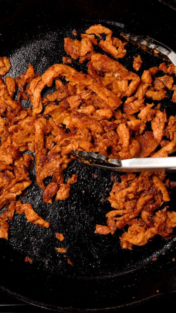 Ideally, grab a 12″ Cast Iron Skillet (you can use non-stick, just make sure you don’t heat it too high) and heat it over high heat for about 3 – 4 minutes. If you see little wisps of smoke, that’s a good indicator that it’s hot enough. Add 1 – 2 Tbsp of high smoke point oil (Vegetable, Canola, Avocado etc) and then add in about 1/3 of the Soy Curls. Just make sure you don’t crowd the pan.