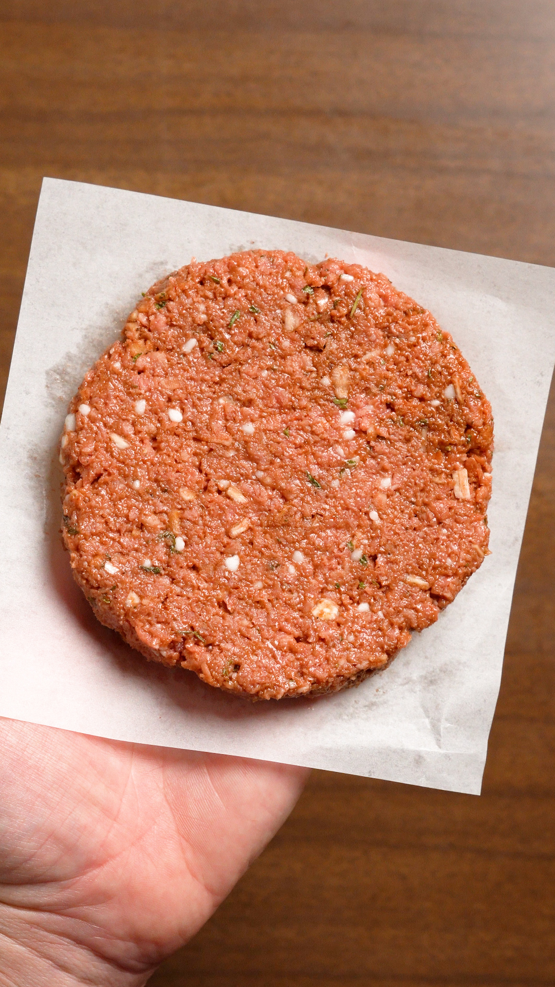 For the patties, I recommend weighing out 4 oz (115g) or 6 oz (170g) patties of the burger mixture. Then form a patty with a cookie cutter. Or use a burger iron or spatula to smash the balls into patties in between 2 pieces of burger paper.