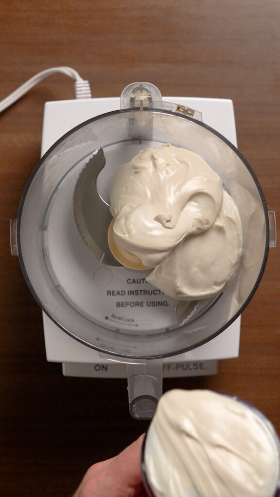 - To a food processor (or high speed blender for smoother texture) add in the Vegan Mayo, or Unsweetened Vegan Yogurt. I actually like doing half a cup of each. If you do all yogurt, you may need to adjust the lemon juice depending on how sour the yogurt is.