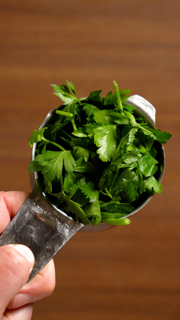 If you can, I recommend weighing the herbs, but at the same time, you can really add or subtract as much as you’d like. I will use the stems, but just the tender parts. If you are measuring them with cups, I suggest packing them in tight!