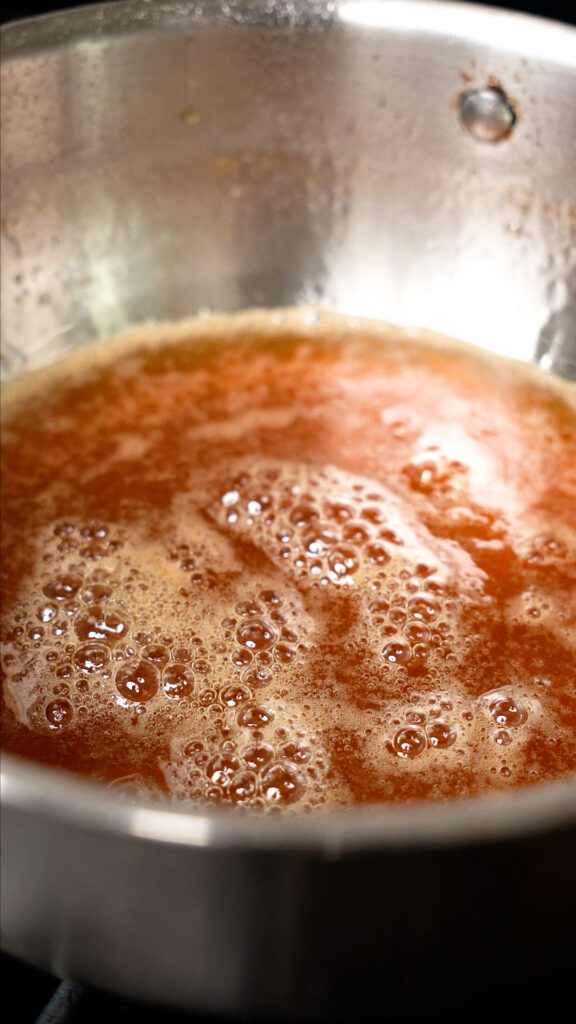 - Once you add everything to the pot, you should have a little over 3 cups worth before you start heating it. Reduce it by half, so 1 ½ cups. Depending on your stove, pot and heat, this can take anywhere from 20 – 35 minutes or longer even. Just keep an eye on it and whisk it every couple of minutes.