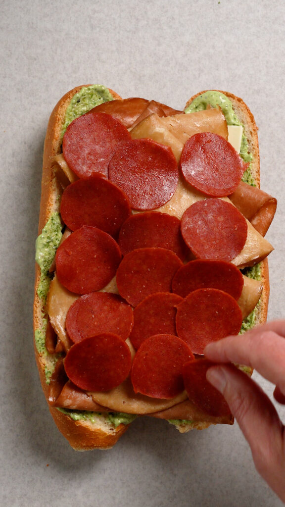 Add some Vegan Cheese, and then as much Vegan Cold Cuts as you’d like! I do about 8 – 12 slices of cold cuts.